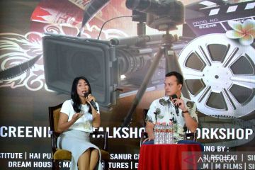 Aktris Happy Salma (kiri) dan aktor Nicholas Saputra (kanan) menyampaikan materi saat workshop industri perfilman di rangkaian kegiatan Bali Digital Fest 2022 di Sanur, Denpasar, Bali, Minggu (10/4/2022). Kegiatan itu diselenggarakan untuk mengembangkan potensi industri kreatif perfilman di Bali. ANTARA FOTO/Fikri Yusuf/wsj.