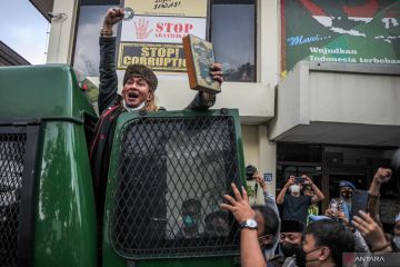 erdakwa kasus dugaan penyebaran berita bohong Bahar Bin Smith menyapa pendukungnya usai menjalani sidang dengan agenda pembacaan eksepsi di Pengadilan Negeri Bandung, Jawa Barat, Selasa (12/4/2022). Dalam sidang tersebut, kuasa hukum Bahar Bin Smith meminta majelis hakim untuk mengabulkan seluruh nota keberatan yang telah dibacakan. ANTARA FOTO/Raisan Al Farisi/hp.