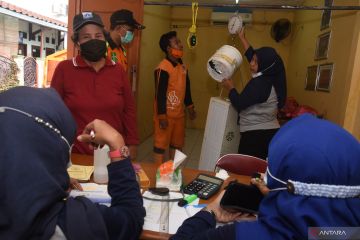Pengurus Bank Sampah Teman Pilah menimbang sampah elektronik milik warga di Kantor RW 05 Kelurahan Bukit Duri, Jakarta, Selasa (12/4/2022). Bank sampah yang didirikan ibu-ibu PKK di RW tersebut menerima hasil pilahan limbah rumah tangga seperti kertas, plastik, elektronik, maupun minyak jelantah guna membantu menciptakan lingkungan yang bersih melalui penanganan sampah dari hilir yang juga menciptakan pundi rupiah bagi warga yang menjadi nasabahnya. ANTARA FOTO/Indrianto Eko Suwarso/foc.