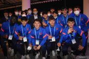 Gubernur DKI Jakarta Anies Baswedan (tengah) berfoto dengan pemain tim sepak bola Atletico Madrid U-18 saat penyambutan acara jamuan makan malam dengan tim peserta International Youth Championship (IYC) 2021 di Balai Kota DKI Jakarta, Selasa (12/4/2022). Acara jamuan makan malam tersebut merupakan rangkaian kegiatan sebelum bergulirnya turnamen IYC 2021 yang diikuti oleh tim Barcelona U-18, Atletico Madrid U-18, Indonesia All Star U-20 dan Bali United U-18 yang digelar di Jakarta Indonesia Stadium (JIS) pada 13-19 April 2022. ANTARA FOTO/Indrianto Eko Suwarso/foc.