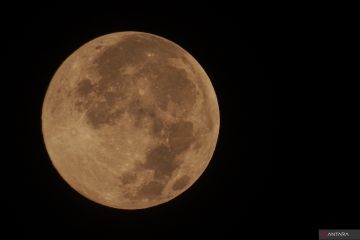 Bulan purnama merah jambu (pink) bersinar di langit kawasan Bekasi, Jawa Barat, Minggu (17/4/2022). Pink Moon itu juga disebut sebagai Purnama Paskah karena terjadi bersamaan dengan Hari Raya Paskah Minggu bagi umat Kristiani dimana puncak purnama pada hari Minggu (17/4/2022) pukul 01.54.58 WIB. ANTARA FOTO/Paramayuda/foc.