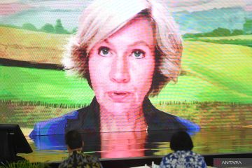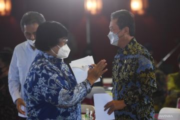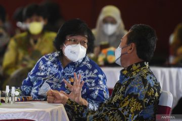 Menteri Lingkungan Hidup dan Kehutanan Siti Nurbaya Bakar (kanan) bersama Menteri Kelautan dan Perikanan Sakti Wahyu Trenggono (kiri) menyimak paparan dari Kepala Perwakilan Bank Dunia untuk Indonesia dan Timor Leste Satu Kahkonen secara daring dalam workshop di Jakarta, Senin (18/4/2022). Workshop itu mengangkat tema blue carbon dalam pembangunan blue economy dan pencapaian target Nationally Determined Contribution (NDC). ANTARA FOTO/Akbar Nugroho Gumay/hp.