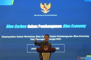 Menteri Kelautan dan Perikanan Sakti Wahyu Trenggono memberikan paparan tentang blue carbon atau karbon yang diserap dan disimpan oleh laut dan ekosistem pesisir (mangrove dan lamun) dalam workshop di Jakarta, Senin (18/4/2022). Workshop itu mengangkat tema blue carbon dalam pembangunan blue economy dan pencapaian target Nationally Determined Contribution (NDC). ANTARA FOTO/Akbar Nugroho Gumay/hp.