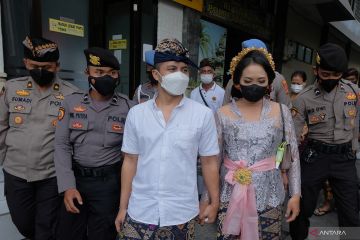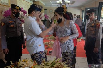 Anggota Polisi mengawal tahanan kasus narkotika I Wayan Bawa Kartika bersama pasangannya saat akan melakukan upacara pernikahan secara adat Bali di Polresta Denpasar, Bali, Senin (18/4/2022). Polresta Denpasar memberikan fasilitas untuk menggelar upacara pernikahan bagi tahanan kasus narkotika yang ditangkap pada 3 Desember 2021 dengan barang bukti 163,64 gram sabu-sabu dan 30 butir ekstasi tersebut dengan pengawasan dan penjagaan ketat dari pihak kepolisian. ANTARA FOTO/Nyoman Hendra Wibowo/hp.