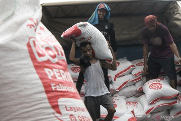 Sejumlah pekerja memindahkan kedelai yang akan didistribusikan ke pengusaha tempe dan tahu di Gudang FKS Multi Agro Bekasi, Jawa Barat, Senin (18/4/2022). Perum BULOG melakukan pengadaan dan penyaluran kedelai ke-13 provinsi dari bulan April hingga Juli 2022 sejumlah total 800.000 ton. ANTARA FOTO/ Fakhri Hermansyah/foc.