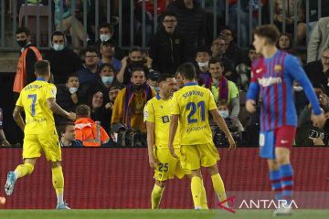 Selebrasi gol pemain Cadiz Lucas Perez ke gawang Barcelona pada lanjutan Liga Spanyol di Camp Nou, Barcelona, Spanyol, Senin (18/4/2022). Barcelona tumbang di kandang melawan tim papan bawah Cadiz dengan skor 0-1. ANTARA FOTO/REUTERS/Albert Gea/rwa.