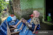 Relawan mengevakuasi seorang lansia saat banjir melanda Kampung Bojongasih, Dayeuhkolot, Kabupaten Bandung, Jawa Barat, Selasa (19/4/2022). Sebanyak 13 RW di Desa Dayeuhkolot dan ribuan jiwa terdampak banjir akibat luapan Sungai Citarum akibat hujan deras di Bandung Raya pada Senin (18/4/2022) malam. ANTARA FOTO/Raisan Al Farisi/rwa.