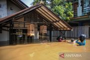 Warga menerjang banjir yang melanda Kampung Bojongasih, Dayeuhkolot, Kabupaten Bandung, Jawa Barat, Selasa (19/4/2022). Sebanyak 13 RW di Desa Dayeuhkolot dan ribuan jiwa terdampak banjir akibat luapan Sungai Citarum akibat hujan deras di Bandung Raya pada Senin (18/4/2022) malam. ANTARA FOTO/Raisan Al Farisi/rwa.