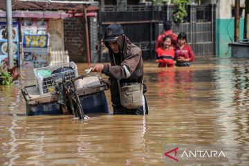 Seorang pedagang tahu menerjang banjir yang melanda Kampung Bojongasih, Dayeuhkolot, Kabupaten Bandung, Jawa Barat, Selasa (19/4/2022). Sebanyak 13 RW di Desa Dayeuhkolot dan ribuan jiwa terdampak banjir akibat luapan Sungai Citarum akibat hujan deras di Bandung Raya pada Senin (18/4/2022) malam. ANTARA FOTO/Raisan Al Farisi/rwa.