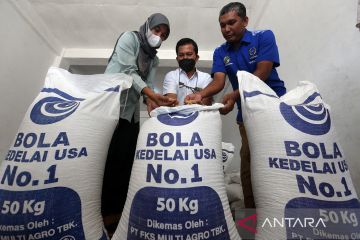 Perajin tahu dan tempe mmeriksa kualitas kedelai impor bersubsidi yang akan disalurkan di Banda Aceh, Aceh, Selasa (19/4/2022). Perum Bulog menyebutkan subsidi kedelai bagi perajin tahu tempe mencapai Rp850 miliar guna menutup selisih harga kedelai di importir dan perajin. ANTARA FOTO/Irwansyah Putra/rwa.