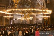 Pelaksanaan shalat tarawih berjamaah pertama yang dihadiri ratusan wisatawan dan warga lokal di Hagia Sophia, Istanbul, Turki, Kamis (21/4/2022) malam waktu setempat. Tarawih pada Ramadhan tahun ini menjadi salah satu peristiwa bersejarah setelah 88 tahun bangunan tersebut difungsikan sebagai museum dan kini dikembalikan statusnya sebagai masjid. ANTARA/Hanni sofia/aa.