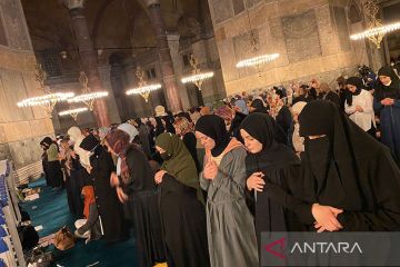 Sejumlah kaum perempuan turut melaksanakan shalat tarawih berjamaah pertama di Hagia Sophia di Istanbul, Turki, Kamis (21/4/2022) malam waktu setempat.Tarawih pada Ramadhan tahun ini menjadi salah satu peristiwa bersejarah setelah 88 tahun bangunan tersebut difungsikan sebagai museum dan kini dikembalikan statusnya sebagai masjid. ANTARA/Hanni sofia/aa.