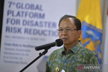 Gubernur Bali Wayan Koster memberikan keterangan pers persiapan penyelenggaraan Global Platform for Disaster Risk Reduction (GPDRR) di Denpasar, Bali, Jumat (22/4/2022). Panitia Nasional GPDRR terus melakukan berbagai persiapan menjelang pelaksanaan forum internasional yang diselenggarakan untuk meninjau kemajuan, berbagi pengetahuan dan mendiskusikan perkembangan dalam penanggulangan risiko bencana yang akan diselenggarakan di Nusa Dua Bali pada 23-29 Mei 2022 tersebut. ANTARA FOTO/Fikri Yusuf/wsj.
