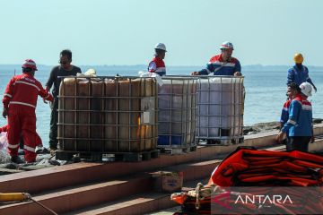 Pekerja menetralisir rembesan minyak di laut dengan Oil Spill Dispersant (OSD) pascatumpahnya solar ke laut di kawasan Pelabuhan Depot Pertamina Desa Hagu Selatan, Lhokseumawe, Aceh, Senin (25/4/2022). Hasil investigasi PT Pertamina Patra Niaga Regional Sumbagut menyatakan tumpahan solar tersebut berasal dari kebocoran bagian lambung Sea Chest kapal MT Aerosea Catalina (Masbos Diaz) sehingga menyebabkan satu ton solar merembes ke laut. ANTARA FOTO/Rahmad/pras.