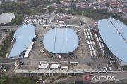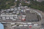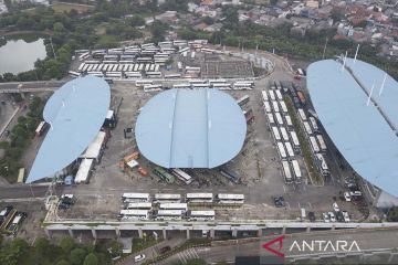 Foto udara sejumlah bus program mudik gratis DKI Jakarta parkir di Terminal Pulogebang, Jakarta Timur, Rabu (27/4/2022). Pemprov DKI Jakarta menyediakan 292 bus yang membawa warga mudik Lebaran 1443 H dengan tujuan Sumatera Selatan, Lampung, Jawa Tengah, dan Jawa Timur. ANTARA FOTO/ Fakhri Hermansyah/aww.