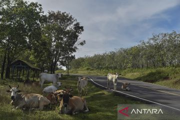 Sejumlah ternak sapi berada di bahu Jalan Pantai Selatan (Pansela) Kabupaten Garut, Jawa Barat, Rabu (27/4/2022). Pada H-5 Lebaran 2022, arus lalu lintas yang melintas di Jalur Pansela Jawa Barat terpantau sepi pemudik. ANTARA FOTO/Adeng Bustomi/aww.