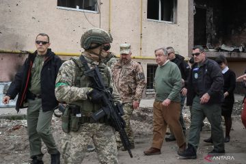 Sekjen PBB Antonio Guterres (tengah) mengunjungi kota Irpin, saat serangan Rusia ke Ukraina masih berlanjut, di luar Kyiv, Ukraina, Kamis (28/4/2022), ANTARA FOTO/Reuters- Gleb Garanich/hp.