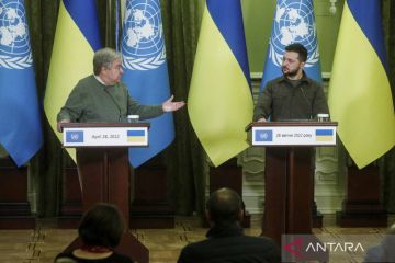 Sekjen PBB Antonio Guterres (kiri) dan Presiden Ukraina Volodymyr Zelenskiy (kanan) menggelar konferensi pers bersama di tengah invasi Rusia ke Ukraina yang terus berlanjut, di Kyiv, Ukraina, Kamis (28/4/2022). ANTARA FOTO/REUTERS/Valentyn Ogirenko/wsj.