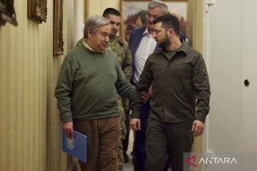 Presiden Ukraina Volodymyr Zelenskiy (kanan) dan Sekjen PBB Antonio Guterres (kiri) berjalan usai menggelar konferensi pers bersama di tengah invasi Rusia ke Ukraina yang terus berlanjut, di Kyiv, Ukraina, Kamis (28/4/2022). ANTARA FOTO/Ukrainian Presidential Press Service/Handout via REUTERS/wsj.