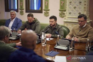 Presiden Ukraina Volodymyr Zelenskiy (kedua kanan) beserta delegasi melakukan pertemuan dengan Sekjen PBB Antonio Guterres (kiri) di tengah invasi Rusia ke Ukraina yang terus berlanjut, di Kyiv, Ukraina, Kamis (28/4/2022). ANTARA FOTO/Ukrainian Presidential Press Service/Handout via REUTERS/wsj.