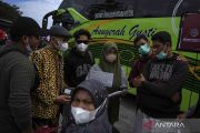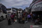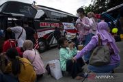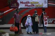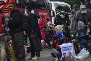 Pemudik menunggu kedatangan bus mereka dalam mudik gratis yang digelar Direktorat Jenderal Perhubungan Darat Kemenhub di Terminal Kampung Rambutan, Jakarta Timur, Jumat (29/4/2022). Pihak kepolisian memprediksi puncak arus mudik lebaran 2022 jatuh pada 29 dan 30 April 2022. ANTARA FOTO/Sigid Kurniawan/wsj.