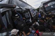 Pemudik antre menaiki bus dalam mudik gratis yang digelar Direktorat Jenderal Perhubungan Darat Kemenhub di Terminal Kampung Rambutan, Jakarta Timur, Jumat (29/4/2022). Pihak kepolisian memprediksi puncak arus mudik lebaran 2022 jatuh pada 29 dan 30 April 2022. ANTARA FOTO/Sigid Kurniawan/wsj.