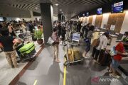 Calon penumpang mengantre di konter lapor diri di Bandara Internasional Juanda Surabaya di Sidoarjo, Jawa Timur, Jumat (29/4/2022). PT Angkasa Pura I Cabang Juanda memprediksi puncak arus mudik penumpang angkutan pesawat udara terjadi pada Sabtu (30/4/) atau H- 2 jelang Lebaran dengan 37 ribu orang penumpang. ANTARA FOTO/Umarul Faruq/wsj.