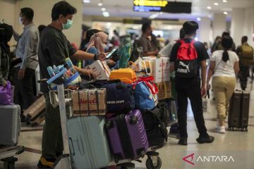 Penumpang berjalan keluar terminal kedatangan setibanya di Bandara Internasional Juanda Surabaya di Sidoarjo, Jawa Timur, Jumat (29/4/2022). PT Angkasa Pura I Cabang Juanda memprediksi puncak arus mudik penumpang angkutan pesawat udara terjadi pada Sabtu (30/4/) atau H- 2 jelang Lebaran dengan 37 ribu orang penumpang. ANTARA FOTO/Umarul Faruq/wsj.