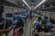 Penumpang Kereta Api Taksaka duduk di dalam gerbong kereta api (KA) di Stasiun Gambir, Jakarta, Sabtu (30/4/2022). Untuk mengatisipasi lonjakan penumpang pada puncak arus mudik hari ini, PT Kereta Api Indonesia (KAI) mengoperasikan 28 KA yang dioperasikan di Stasiun Senen dengan volume penumpang berangkat 18.600 orang dari total tempat duduk tersedia sebanyak 20.500, sementara di Stasiun Gambir 35 KA dengan volume penumpang berangkat sebanyak 16.100 orang dari total tempat duduk tersedia 16.900. ANTARA FOTO/Galih Pradipta/wsj.