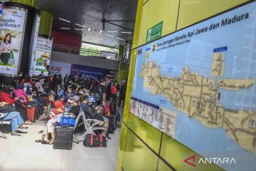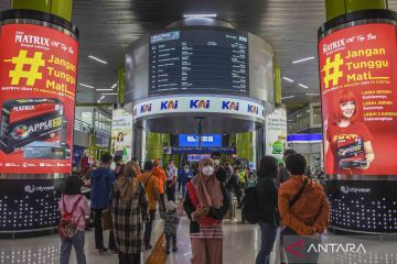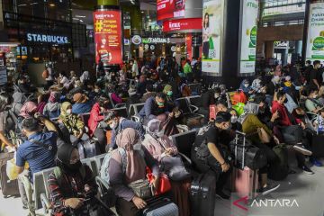 Calon penumpang Kereta Api Taksaka menunggu kedatangan kereta di Stasiun Gambir, Jakarta, Sabtu (30/4/2022). Untuk mengatisipasi lonjakan penumpang pada puncak arus mudik hari ini, PT Kereta Api Indonesia (KAI) mengoperasikan 28 KA yang dioperasikan di Stasiun Senen dengan volume penumpang berangkat 18.600 orang dari total tempat duduk tersedia sebanyak 20.500, sementara di Stasiun Gambir 35 KA dengan volume penumpang berangkat sebanyak 16.100 orang dari total tempat duduk tersedia 16.900. ANTARA FOTO/Galih Pradipta/wsj.
