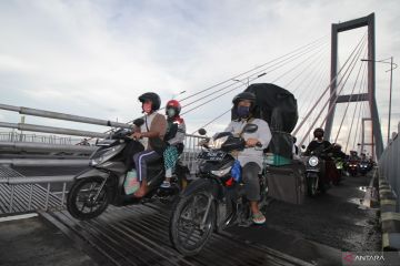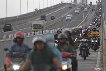 Pengendara motor melintas di Jembatan Suramadu, Surabaya, Jawa Timur, Sabtu (30/4/2022). Pada H-2 Hari Raya Idul Fitri 1443 H, jembatan yang menjadi penguhubung antara Pulau Jawa dan Pulau Madura tersebut mulai dipadati kendaraan terutama roda dua yang mudik menuju ke Pulau Madura. ANTARA FOTO/Moch Asim/hp.