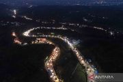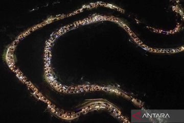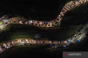 Foto udara sejumlah kendaraan melintas dalam antrean di Jalur Selatan Lingkar Gentong, Kadipaten, Kabupaten Tasikmalaya, Jawa Barat, Jumat (6/5/2022) malam. Pada H+3 Lebaran, arus lalu lintas menuju Bandung-Jakarta dan sebaliknya terpantau padat merayap. ANTARA FOTO/Adeng Bustomi/wsj.