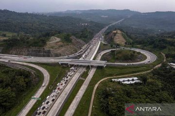 Foto udara kendaraan roda empat yang didominasi pemudik melintas di Jalan Tol Trans Jawa, Semarang-Solo Km 441 B, Bawen, Kabupaten Semarang, Jawa Tengah, Jumat (6/5/2022). Volume kendaraan dari arah Solo dan Jawa Timur yang akan menuju DKI Jakarta maupun Jawa Barat melalui jalur tersebut terpantau padat pada H+3 Lebaran hingga pukul 17:30 WIB. ANTARA FOTO/Aji Styawan/wsj.