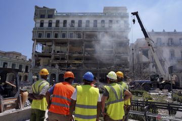 Para pekerja menyaksikan alat berat membersihkan puing-puing bangunan usai sebuah ledakan terjadi di Hotel Saratoga di Havana, Kuba, Jumat (6/5/2022). Setidaknya 22 orang tewas dalam insiden ledakan di Hotel Saratoga tersebut yang diduga disebabkan oleh kebocoran gas. ANTARA FOTO/REUTERS/Alexandre Meneghini/wsj.