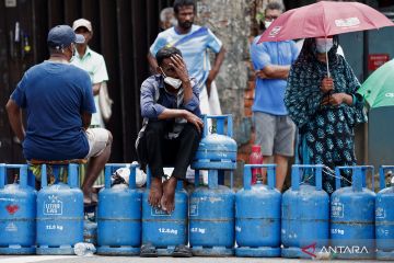 Antrean warga menunggu distribusi gas menutup jalan di Colombo saat krisis ekonomi di Sri Lanka, Minggu (8/5/2022). ANTARA FOTO/REUTERS/Dinuka Liyanawatte/foc.