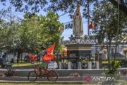 Seorang pedagang berkeliling sambil mengibarkan bendera nasional Timor Leste di Kawasan Jardim 5 de Maio, Dili, Timor Leste, Rabu (18/5/2022). Menjelang pelantikan Presiden Timor Leste Jose Ramos Horta dan Perayaan 20 Tahun Restorasi Kemerdekaan Timor Leste, beberapa daerah di Timor Leste mendapat pengamanan ketat dari petugas Polisi Nasional Timor Leste. ANTARA FOTO/Galih Pradipta/rwa.