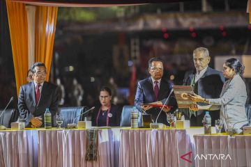 Presiden Timor Leste Jose Ramos Horta (kedua kanan) mengucapkan sumpah jabatan disaksikan Ketua Parlemen Timor Leste Ancieto Longuinhos (ketiga kanan) dan Presiden Timor Leste periode 2017-2022 Francisco Guterres (kiri) saat Pelantikan Presiden Timor Leste di Tasi-Tolu, Dili, Timor Leste, Kamis (19/5/2022) malam. Jose Ramos Horta resmi terpilih kembali dan menjadi Presiden ke-5 Timor Leste untuk periode 2022-2027 setelah Restorasi Kemerdekaan Timor Leste. ANTARA FOTO/Galih Pradipta/wsj.