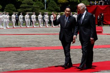 Presiden AS Joe Biden (kanan) dan Perdana Menteri Jepang Fumio Kishida berjalan melewati pasukan kehormatan saat upacara penyambutan Presiden Biden, di wisma negara Istana Akasaka, di Tokyo, Jepang, Senin (23/5/2022). ANTARA FOTO/Reuters-Eugene Hoshiko/Pool/hp.