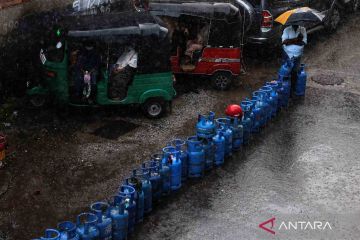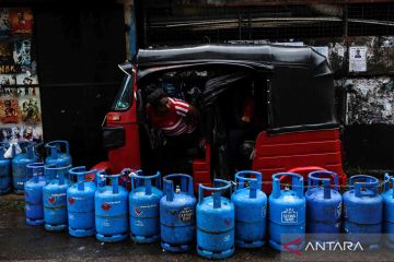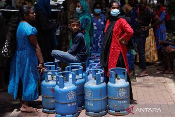 Tabung gas LPG milik warga berjajar saat antrean pembelian di sebuah depo penjualan di tengah krisis ekonomi yang melanda di Kota Kolombo, Sri Lanka, Senin (23/5/2022). ANTARA FOTO/REUTERS/Dinuka Liyanawatte/wsj.