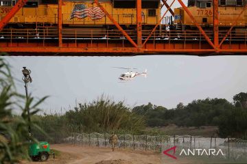 Sebuah helikopter terbang di atas Rio Grande yang merupakan wilayah patroli Texas Army National Guard di Eagle Pass, Texas, Amerika Serikat, Senin (23/5/2022). ANTARA FOTO/REUTERS/Marco Bello/rwa.
