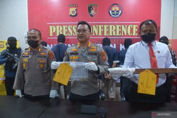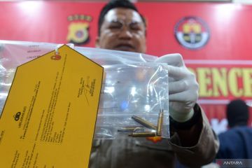 Kabid Humas Polda Aceh Kombes Pol Winardy memperlihatkan barang bukti kasus penembakan berupa selongsong peluru serta menghadirkan tersangka konferensi pers di Polda Aceh, Banda Aceh, Aceh, Senin (30/5/2022). Polda Aceh menangkap lima pelaku yang diduga terlibat kasus penembakan dua warga yang meninggal di Aceh Besar pada Kamis (12/5/2022) serta mengamankan barang bukti tiga selongsong peluru kaliber 5,56 milimeter, sepotong kayu, sebo dan sepeda motor sementara seorang eksekutor masih buron. ANTARA FOTO/Ampelsa/hp.