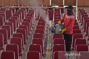 Petugas menyemprotkan cairan disinfektan pada ruangan aula di Asrama Haji Pondok Gede, Jakarta, Rabu (1/6/2022). Kementerian Agama mempersiapkan sarana dan prasarana di lokasi tersebut unduk menyambut jamaah jemaah calon haji DKI Jakarta mulai Jumat (3/6/2022). ANTARA FOTO/Aditya Pradana Putra/aww.