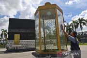 Petugas membersihkan replika maqam Ibrahim dan Ka'bah di Asrama Haji Pondok Gede, Jakarta, Rabu (1/6/2022). Kementerian Agama mempersiapkan sarana dan prasarana di lokasi tersebut unduk menyambut jamaah jemaah calon haji DKI Jakarta mulai Jumat (3/6/2022). ANTARA FOTO/Aditya Pradana Putra/aww.