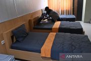 Petugas merapikan tempat tidur pada kamar jemaah calon haji di Asrama Haji Pondok Gede, Jakarta, Rabu (1/6/2022). Kementerian Agama mempersiapkan sarana dan prasarana di lokasi tersebut unduk menyambut jamaah jemaah calon haji DKI Jakarta mulai Jumat (3/6/2022). ANTARA FOTO/Aditya Pradana Putra/aww.
