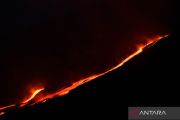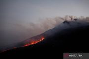 Lava pijar mengalir dari kawah Gunung Etna yang erupsi seperti terlihat dari kawasan Pizzi Deneri, di sebelah utara Kepulauan Sicily, Catania, Italia, Selasa (31/5/2022). ANTARA FOTO/REUTERS/Antonio Parrinello/wsj.