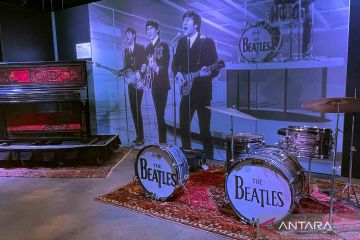 Satu set alat musik drum yang dipakai oleh drummer the Beatles Ringo Star saat acara "The Ed Sullivan Show" dipajang dalam Pameran "American History" yang menampilkan barang koleksi pribadi milik miliarder AS Jim Irsay di Kota New York, Amerika Serikat, Kamis (2/6/2022). ANTARA FOTO/REUTERS/Hussein Waaile /wsj.