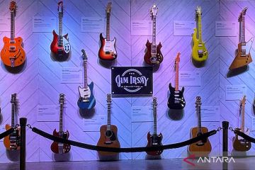 Sejumlah gitar yang pernah digunakan oleh Bob Dylan, the Beatles, Prince, Eric Clapton, Kurt Cobain, The Grateful Dead dan Pink Flyod dipajang dalam Pameran "American History" yang menampilkan barang koleksi pribadi milik miliarder AS Jim Irsay di Kota New York, Amerika Serikat, Kamis (2/6/2022). ANTARA FOTO/REUTERS/Hussein Waaile /wsj.