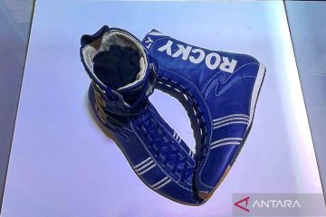 Sepatu tinju yang dipakai oleh petinju juara dunia Muhammad Ali saat bertanding melawan Joe Frazier di the Thrilla in Manila dipajang dalam Pameran "American History" yang menampilkan barang koleksi pribadi milik miliarder AS Jim Irsay di Kota New York, Amerika Serikat, Kamis (2/6/2022). ANTARA FOTO/REUTERS/Hussein Waaile /wsj.