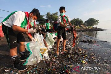 Sejumlah anggota Pramuka memunguti sampah di pantai dekat Jembatan Suramadu, Surabaya, Jawa Timur, Minggu (5/6/2022). Aksi di kawasan wisata pantai itu dalam rangka Hari Lingkungan Hidup Sedunia. ANTARA FOTO/Didik Suhartono/rwa.