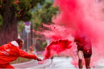 Seorang relawan melempar bedak berwarna saat berlangsumg lomba Color Run di Moskow, Rusia, minggu (5/5/2022). ANTARA FOTO/Reuters- Maxim Shemetov/hp.